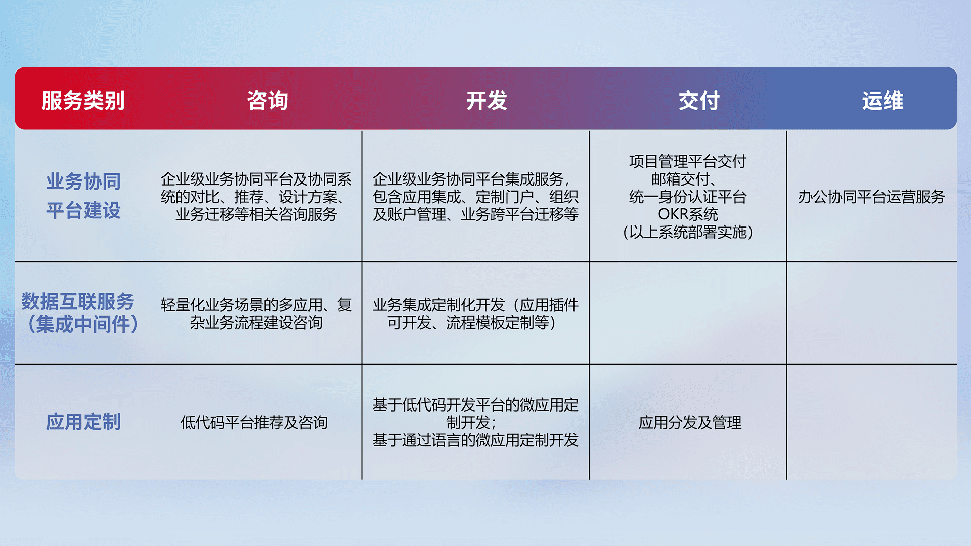 针对钉钉、、、、企微、、、IDaas等平台级产品提供产品的规划、、、方案、、、、交付、、、、定制化开发等服务,,,,实现如统一协同办公、、、智能客户服务、、混合会议管理、、、智能数据查询、、、等业务场景,,实现数字化转型。。。。
